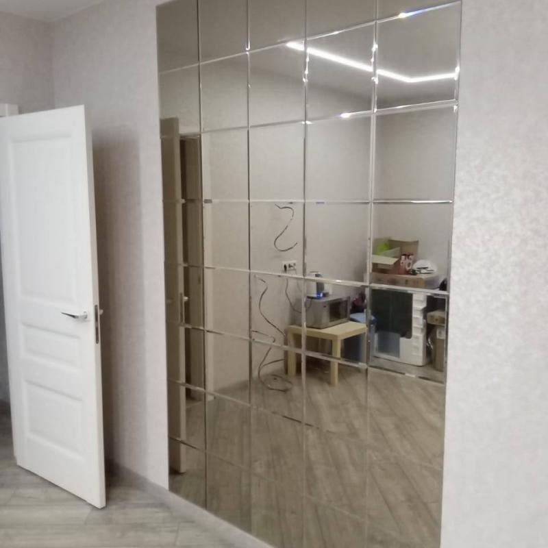 Зеркальное панно из квадратной плитки – не редкость, но расположение плитки прямо, а не диагонально, выбирают не часто. Наверное, потому, что прямое расположение несколько визуально утяжеляет панно.